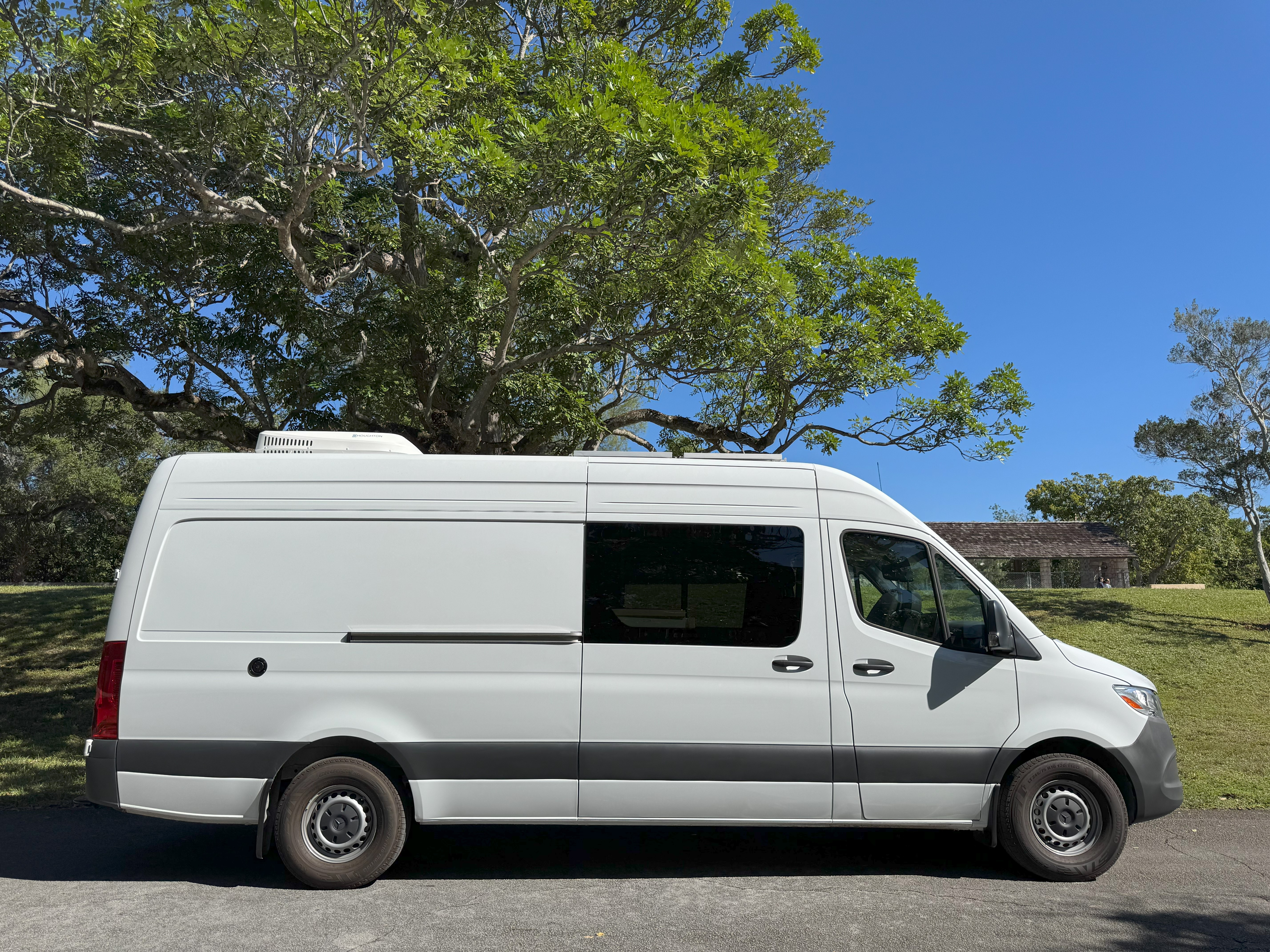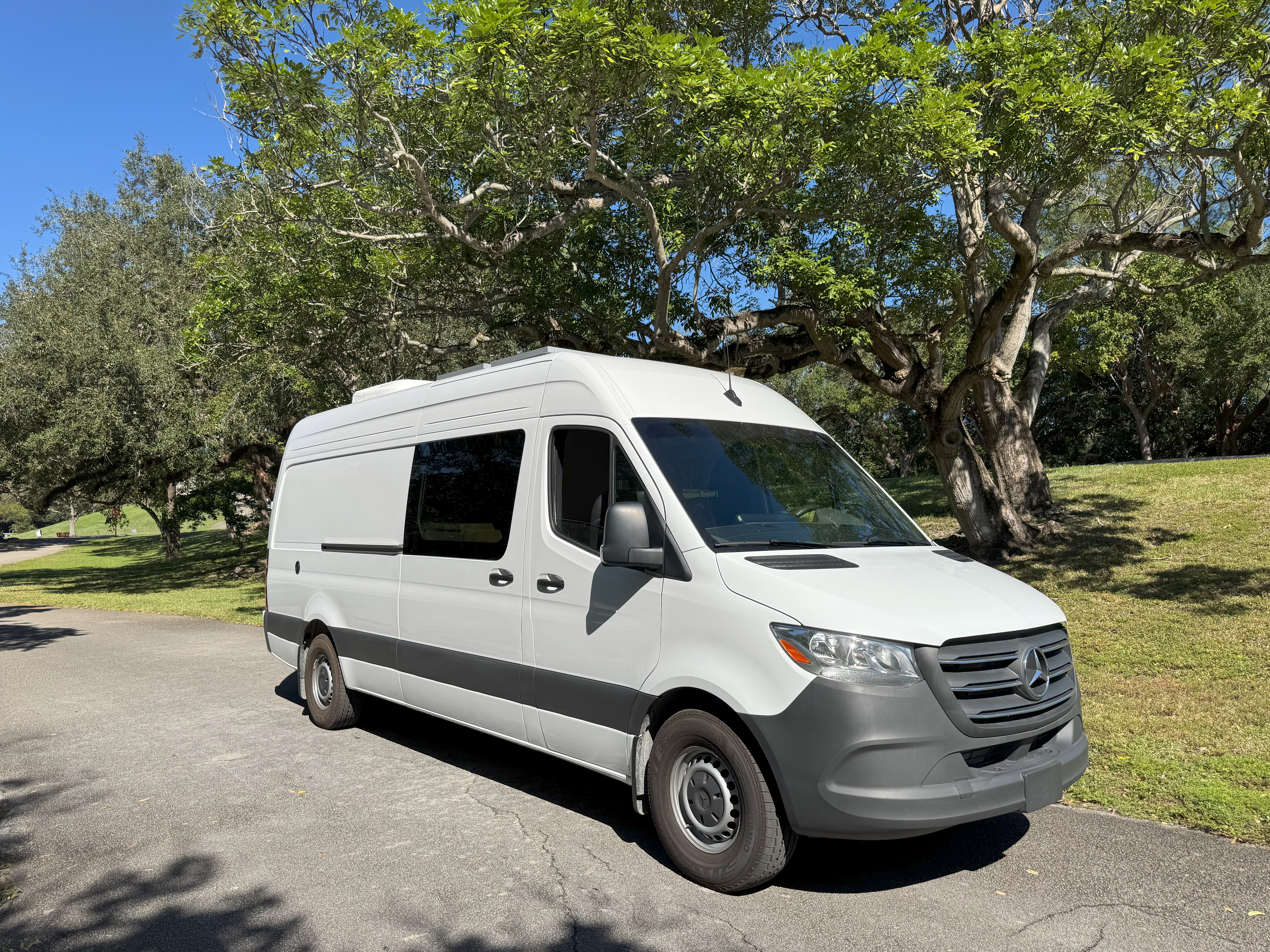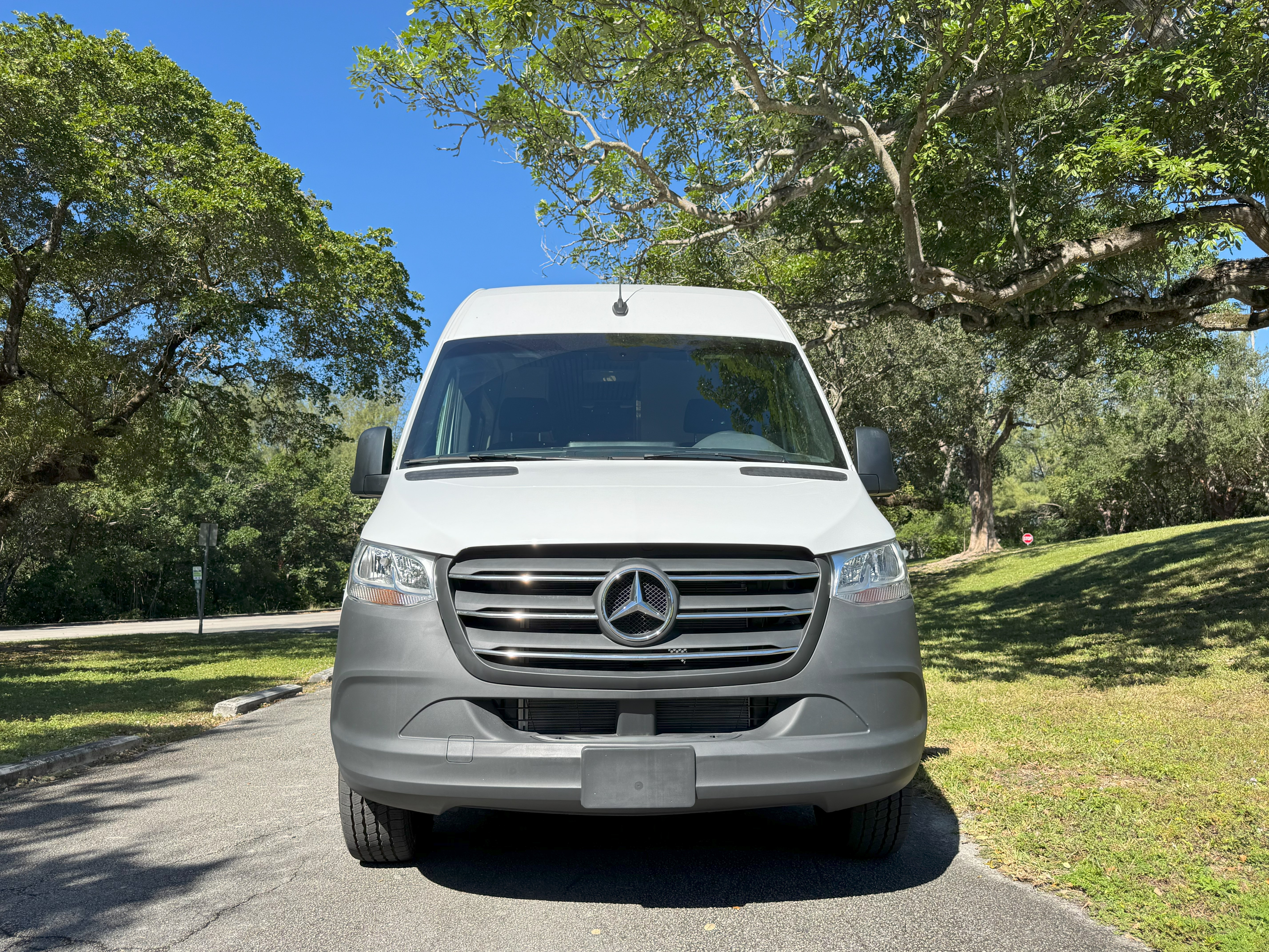 NEW Custom Converted 2024 Mercedes Sprinter Van 2500 2WD (157 mileage). 170″ Wheelbase, High Roof, Arctic White. 2.0L 4 cylinders Diesel. Main features: exclusive design, indoor shower and toilet, modern kitchen with induction cooktop, microwave and refrigerator with freezer, comfortable queen bed, swivel seats and table, air conditioning and fan.