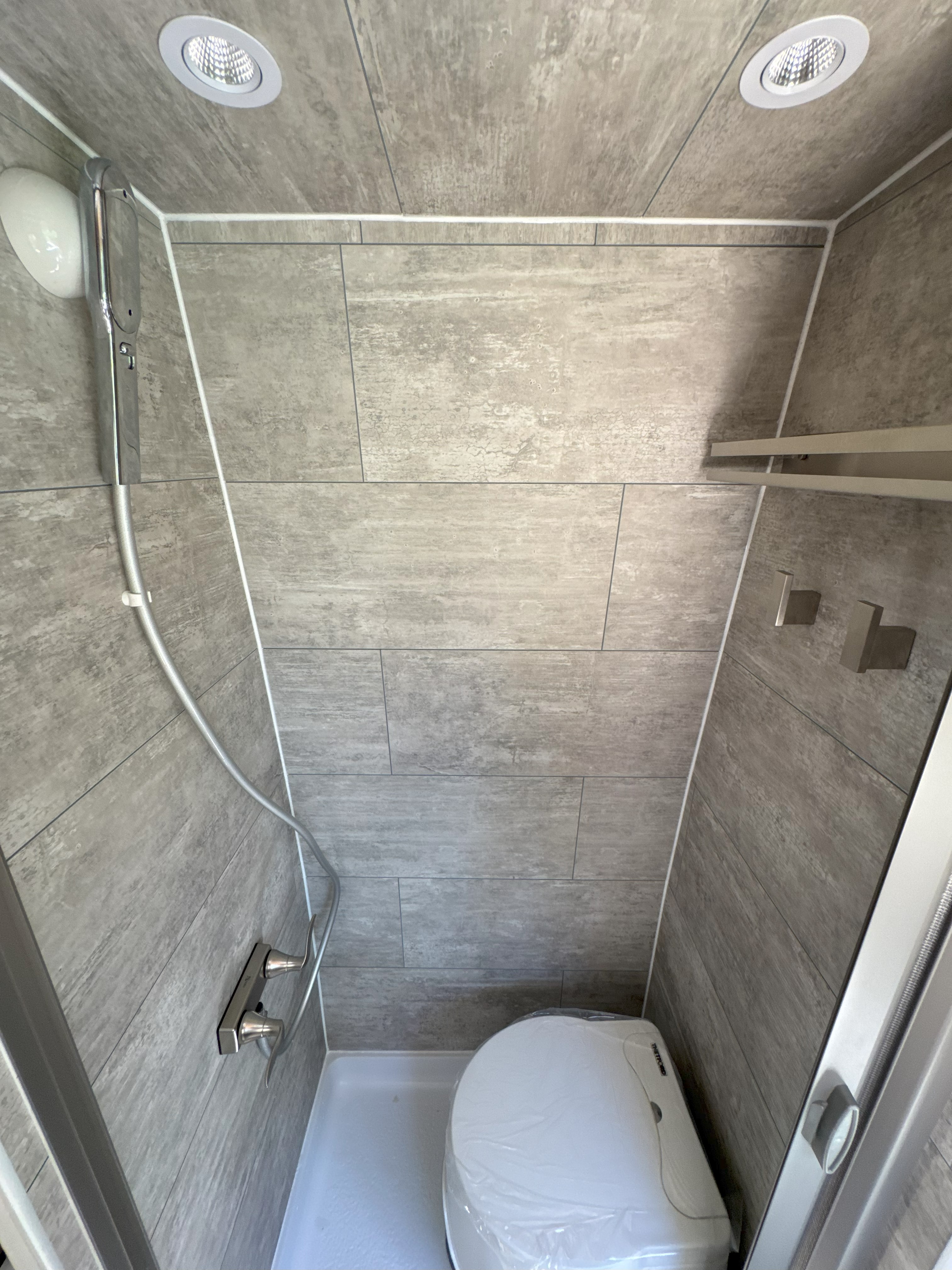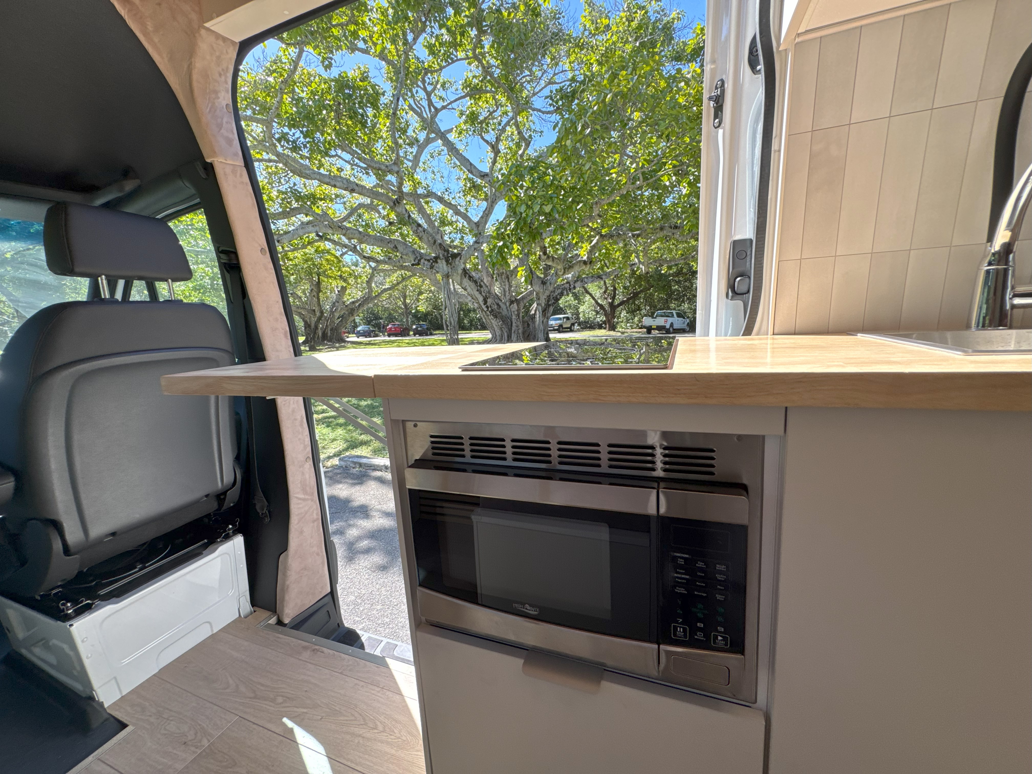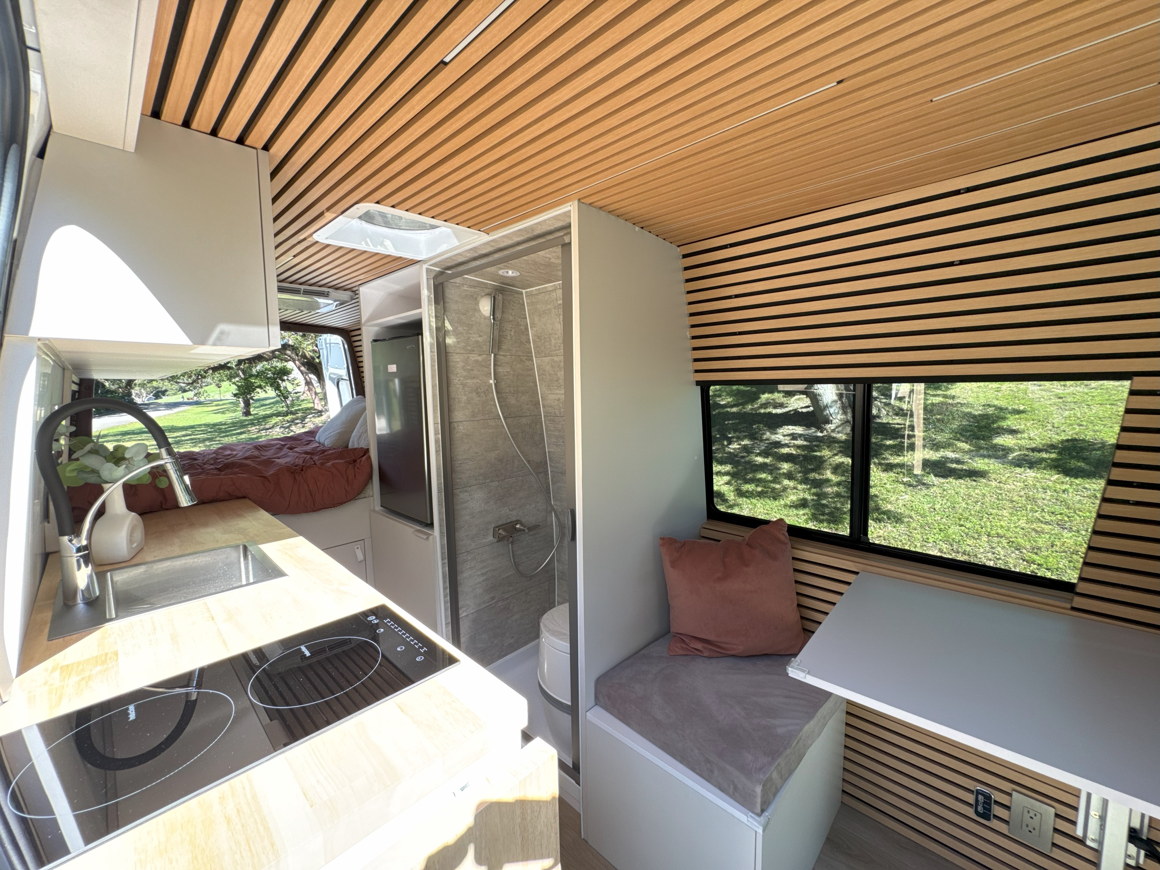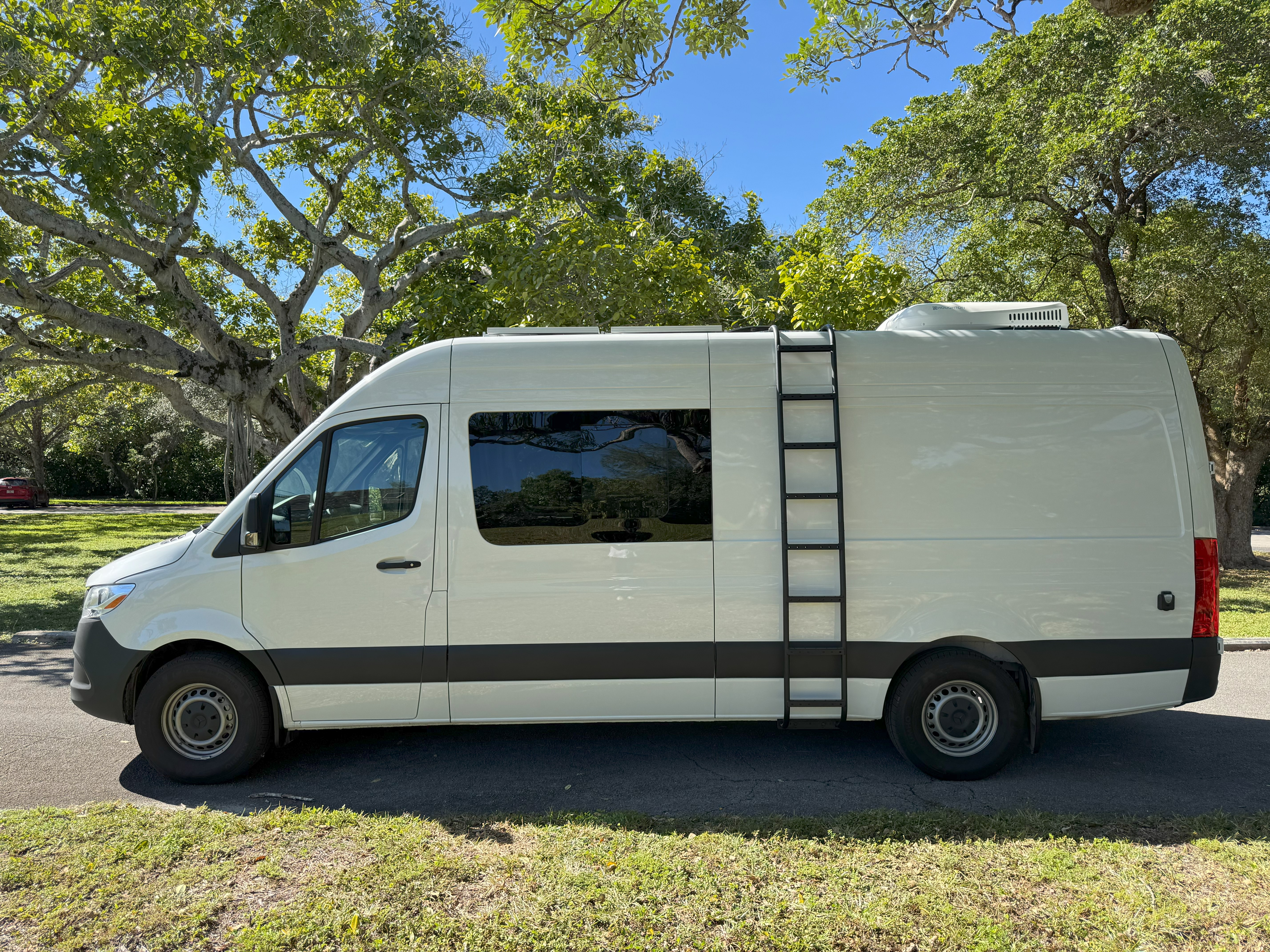 NEW Custom Converted 2024 Mercedes Sprinter Van 2500 2WD (157 mileage). 170″ Wheelbase, High Roof, Arctic White. 2.0L 4 cylinders Diesel. Main features: exclusive design, indoor shower and toilet, modern kitchen with induction cooktop, microwave and refrigerator with freezer, comfortable queen bed, swivel seats and table, air conditioning and fan.